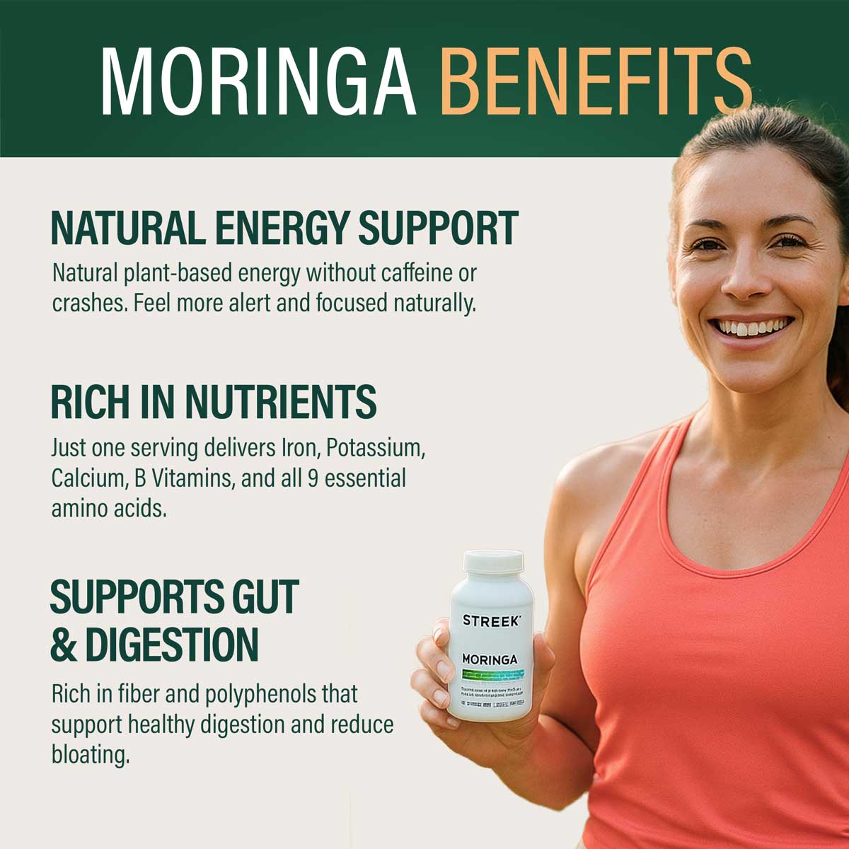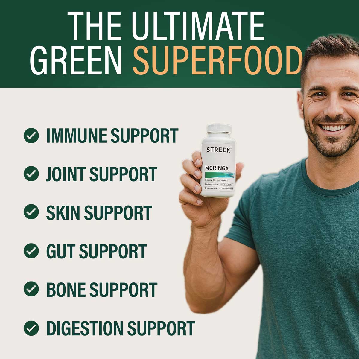 Streek Moringa delivers 1200mg of pure moringa leaf extract per serving.